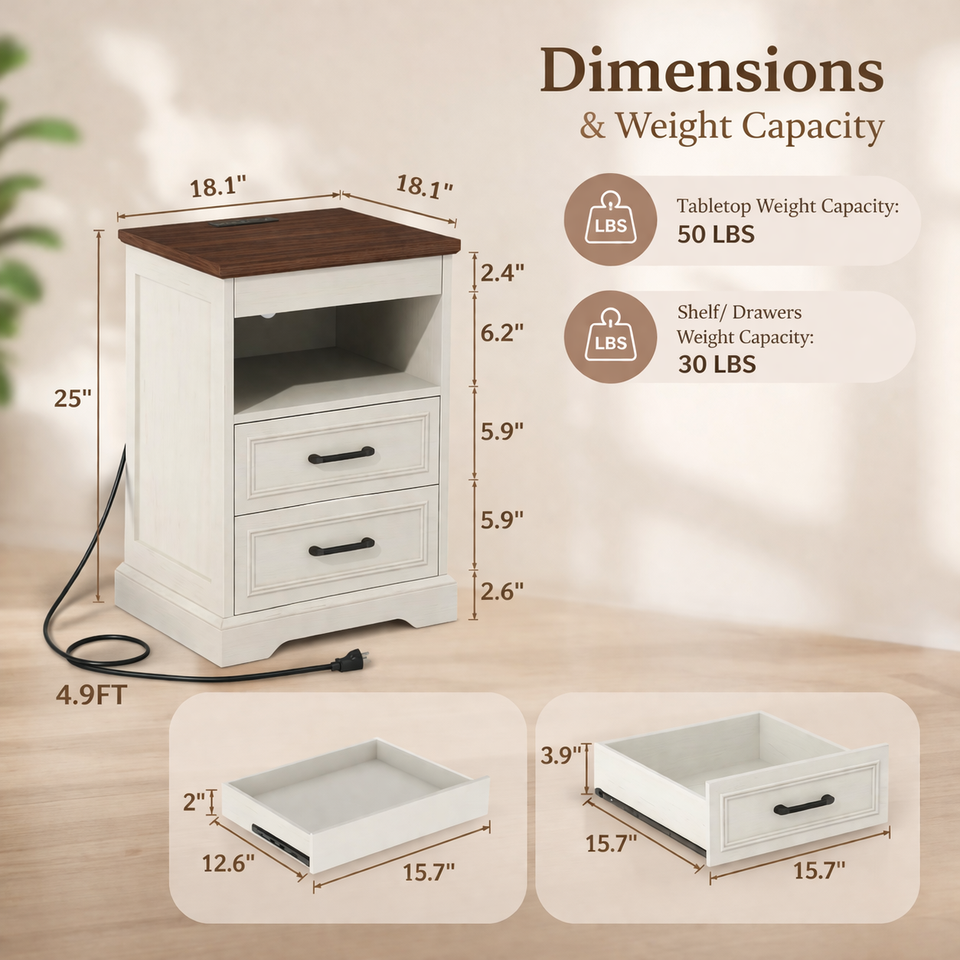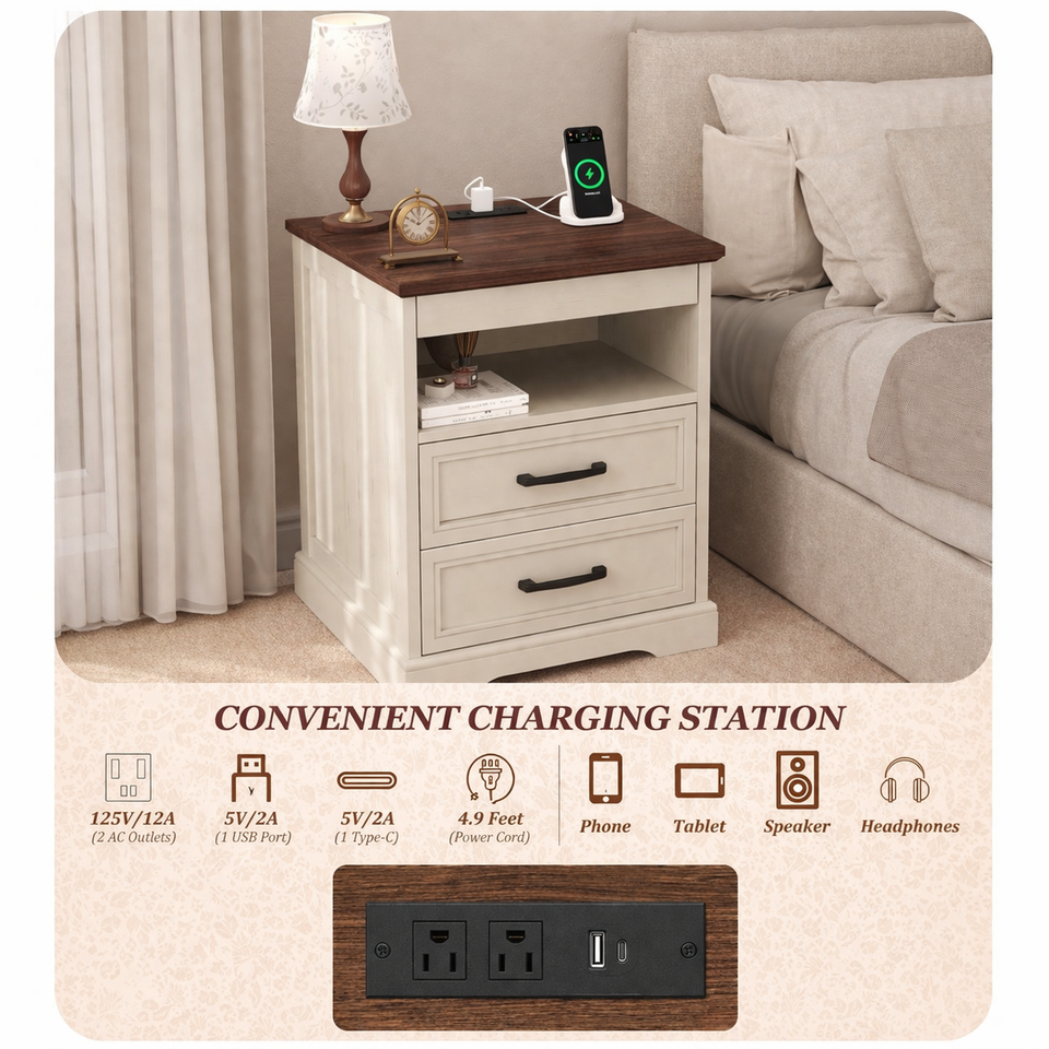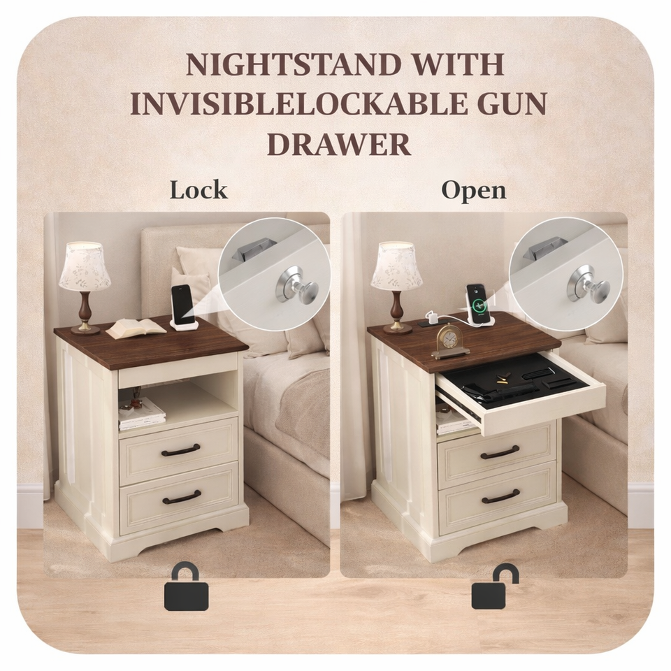 Mesita de Noche Moderna con Cajón Oculto con Cerradura, Carga Inalámbrica, Gabinete de Almacenamiento Secreto para Dormitorio, LED, Hogares Inteligentes