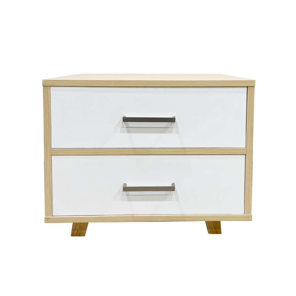 Mesita de Noche Moderna de Estilo Nórdico con Dos Cajones, Madera de Manzano con Tiradores Plateados para Dormitorio y Sala de Estar