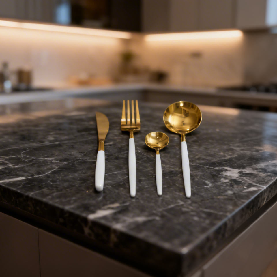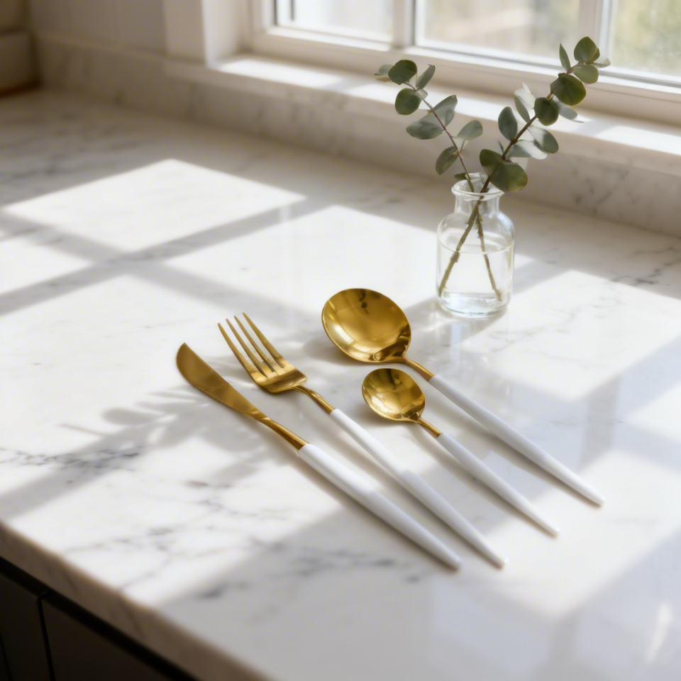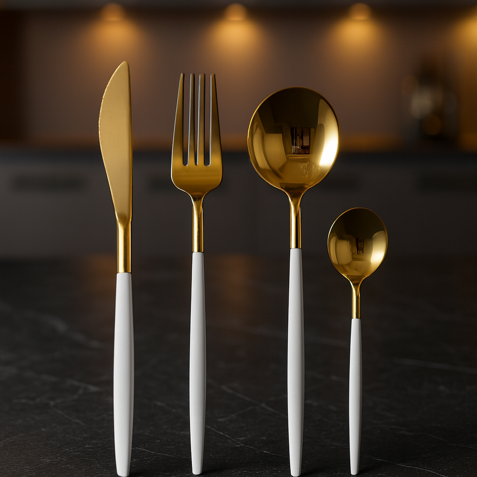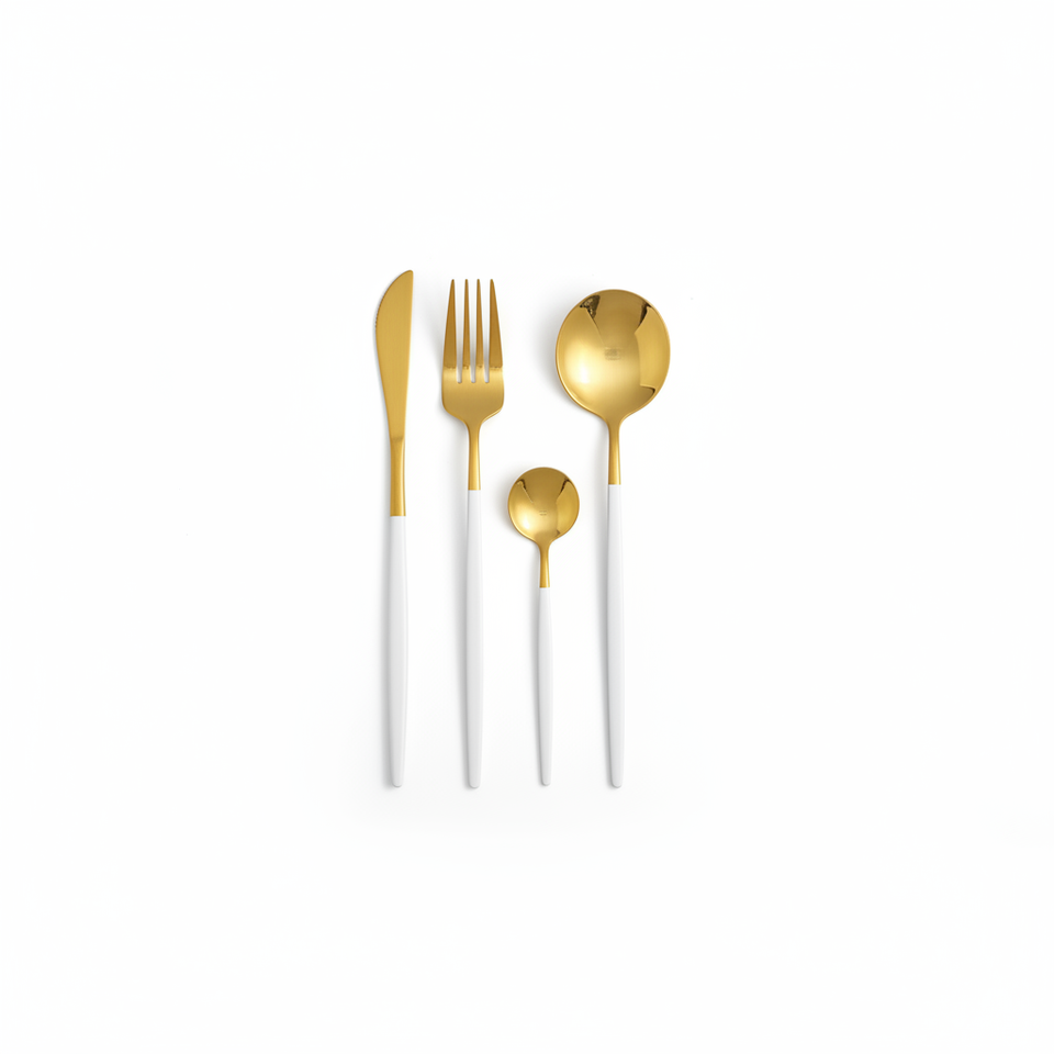 Juego de cubiertos de estilo nórdico moderno, chapado en oro, con mango blanco, ecológico, de acero inoxidable.