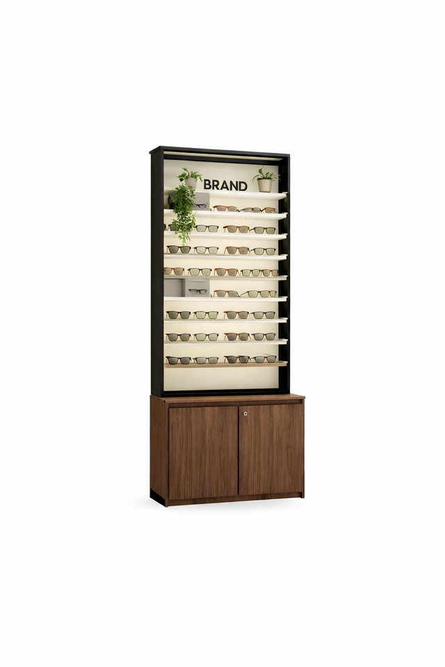Exhibidor de Pared Moderno para Gafas, Estante de Madera para Exhibición de Gafas en Tiendas, con Gabinete de Almacenamiento, Diseño Premium con Iluminación LED
