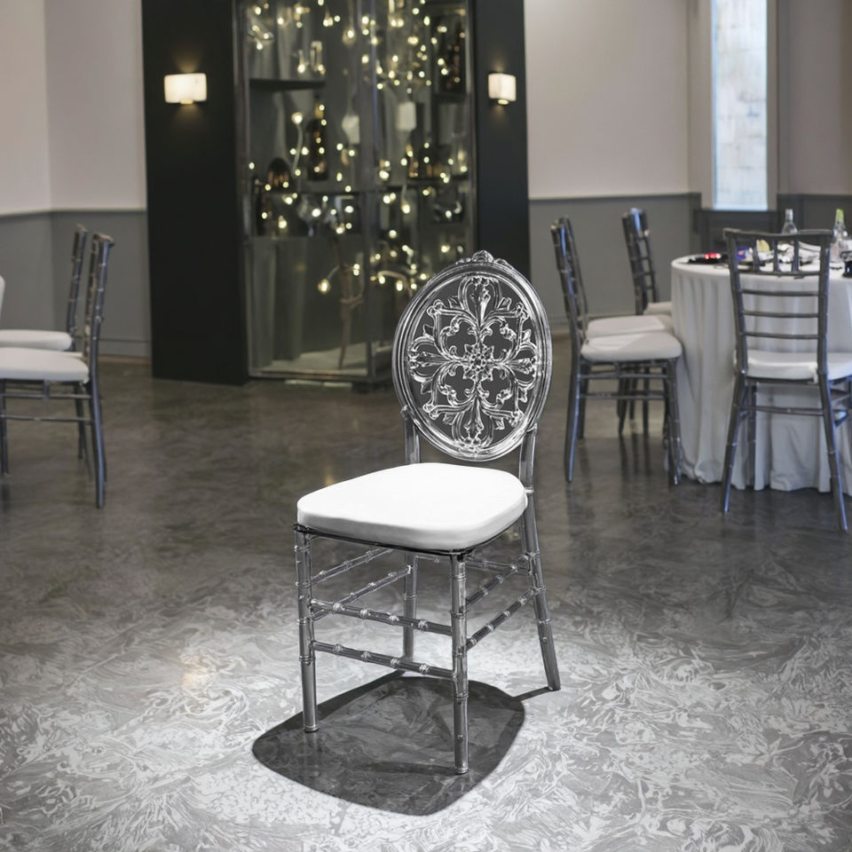 Silla apilable transparente y ornamentada moderna para banquetes, hoteles, villas, fiestas al aire libre y salas de estar, fábrica de muebles al por mayor