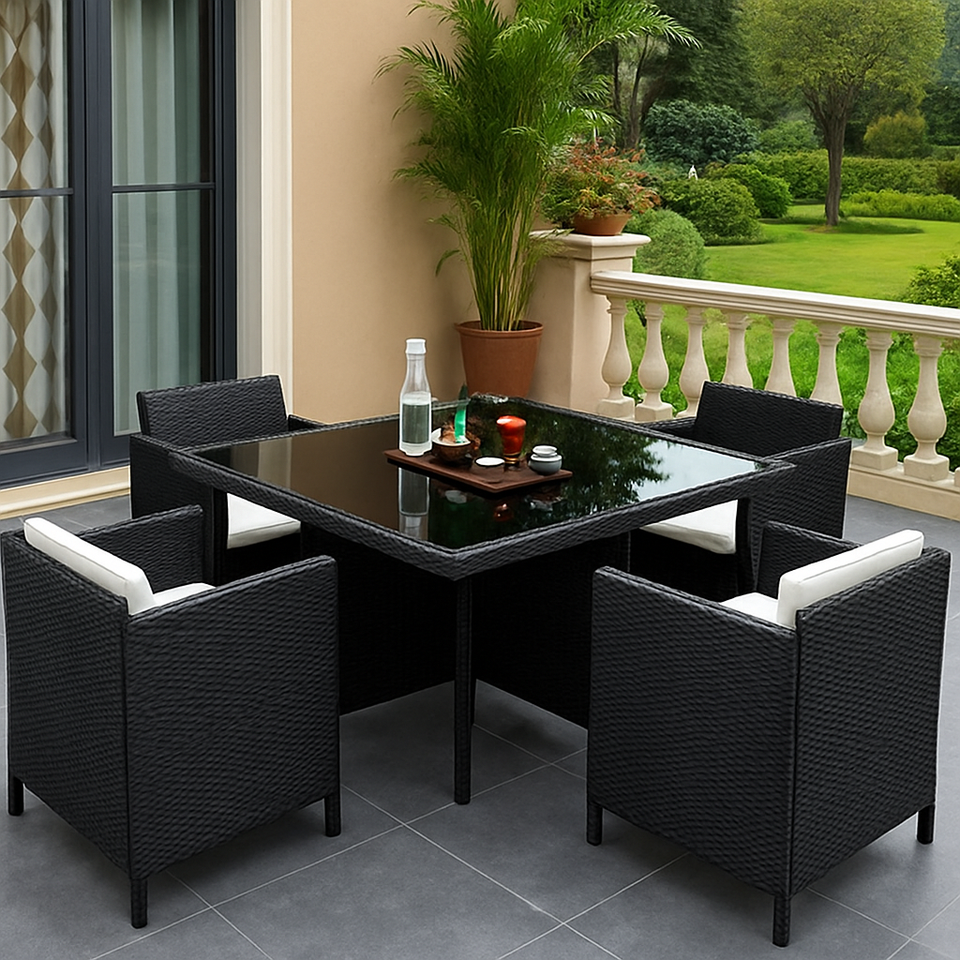 Moderno Juego de Comedor de Ratán Sintético para Exteriores con Mesa de Vidrio Templado y 4 Sillones para Jardín, Patio, Balcón y Uso Junto a la Piscina