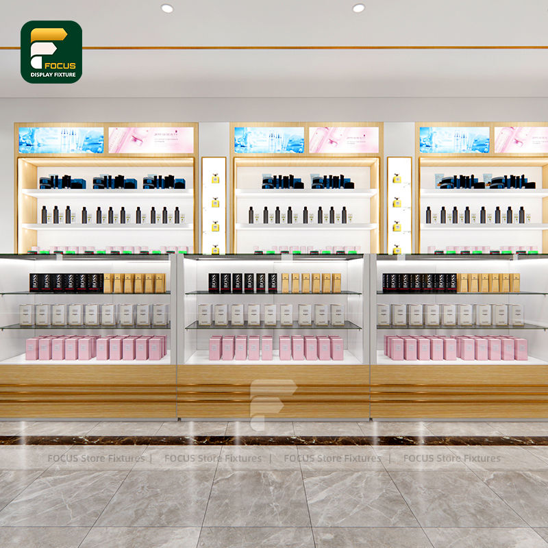 Tienda de perfumes moderna Accesorio de exhibición Gabinete de mostrador de vidrio Muebles al por menor personalizados Fragancia Marca Tienda Diseño de interiores