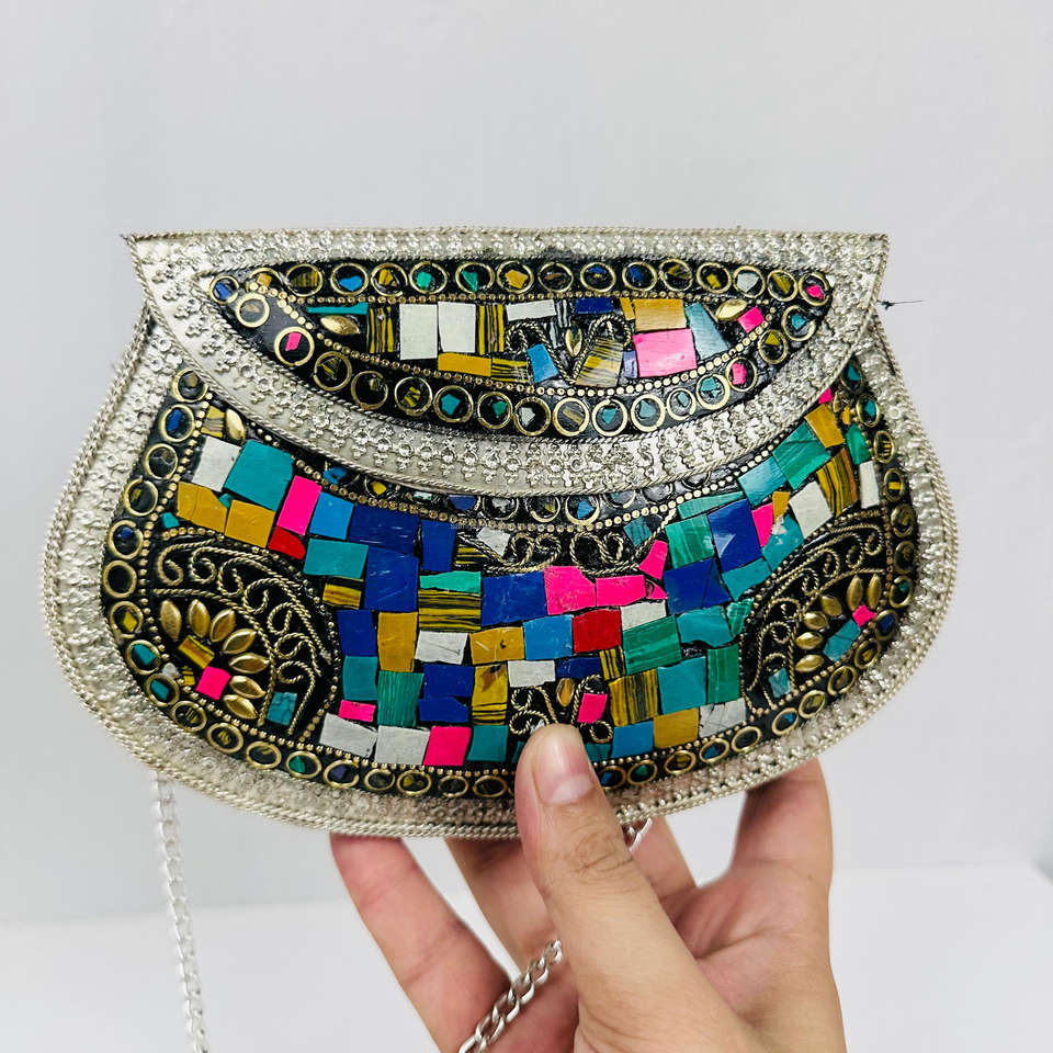 Bolso de Mano Étnico de Boda con Mosaico Multicolor de Aluminio Pulido Chapado en Oro Moderno, Estilo Bandolera con Escultura Antigua para Festivales