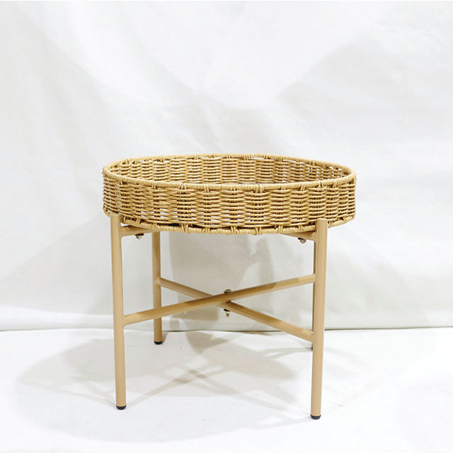 Mesa Auxiliar Redonda Moderna de Poliratán con Patas Metálicas en Forma de X y Borde Superior Tejido