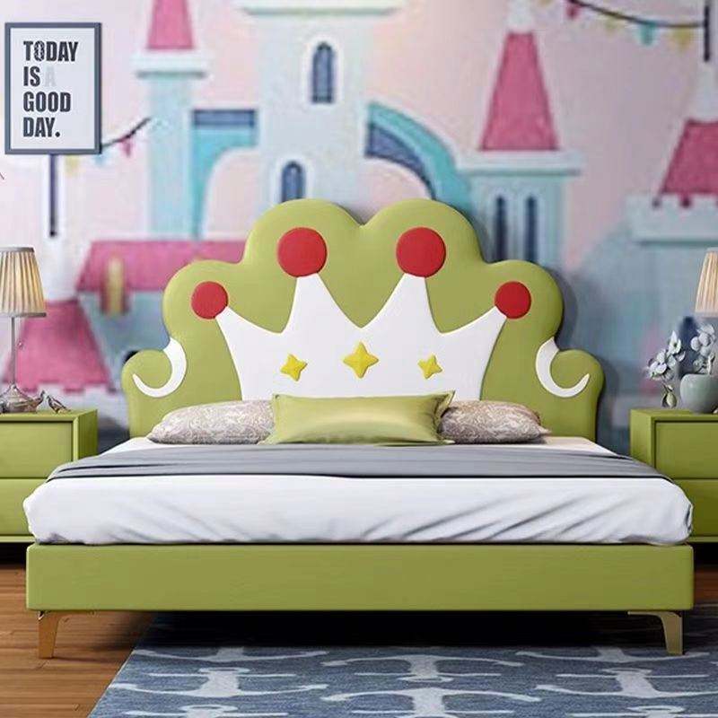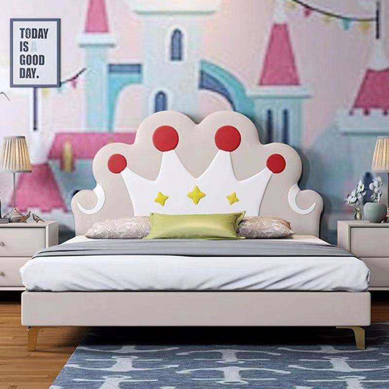 Cama individual moderna de princesa, diseño de corona tapizado de algodón de madera maciza