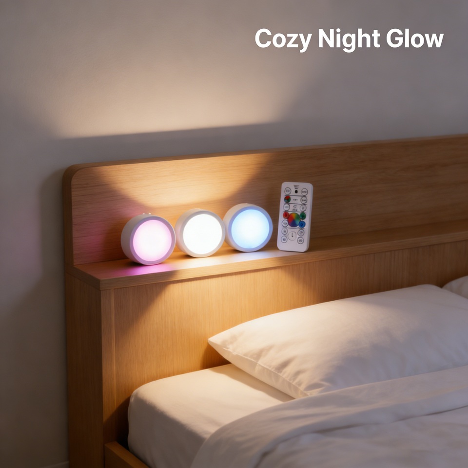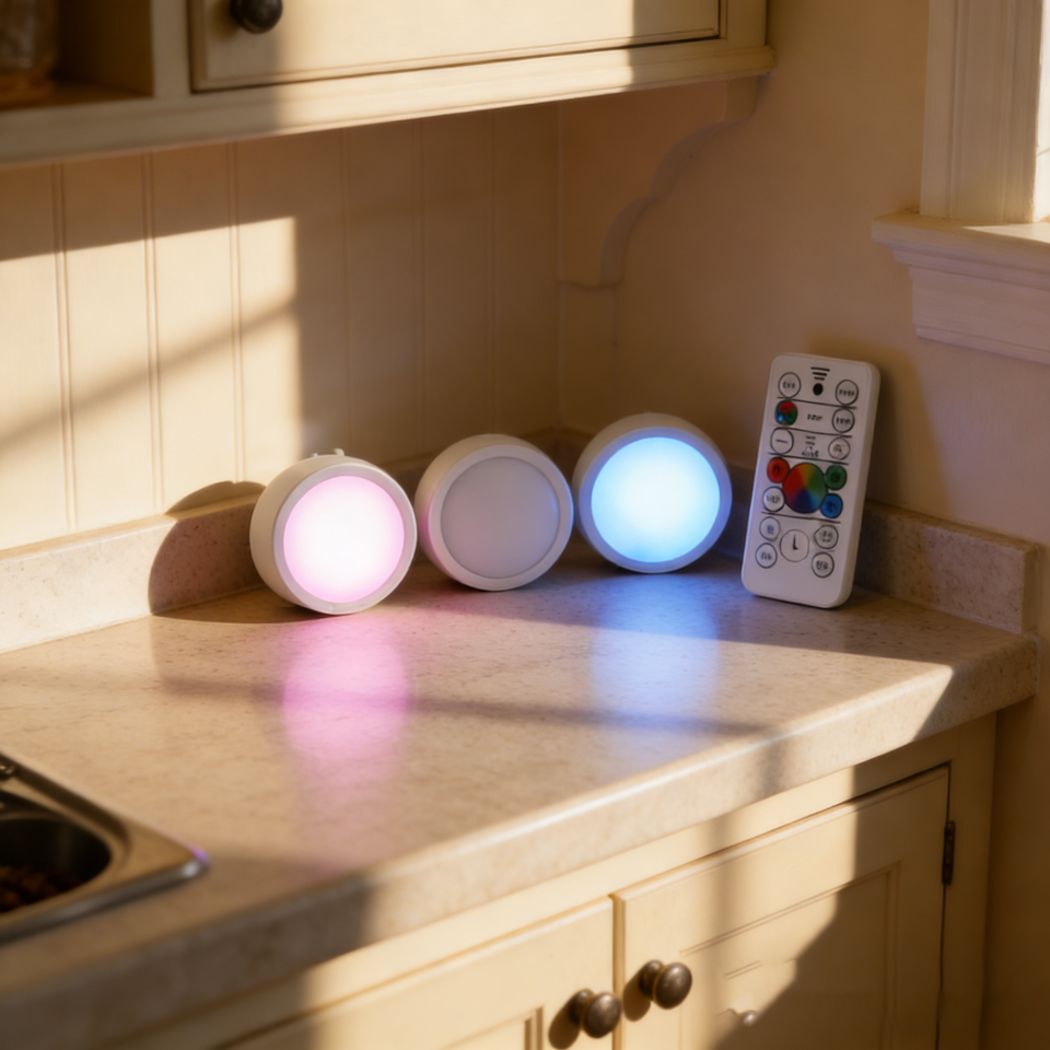 Luces LED RGB Modernas con Control Remoto, Funcionan con Batería, Regulables, Fácil Instalación, para Montar en Pared o Gabinete, Paquete de 3