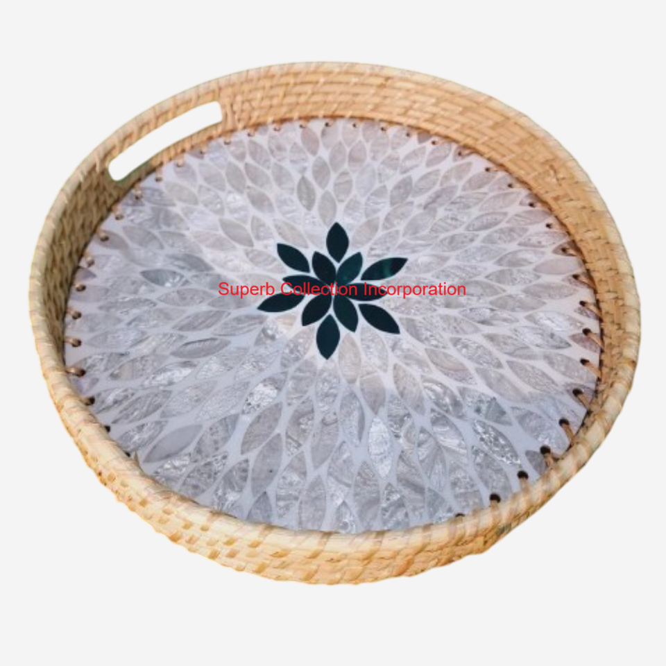 Bandeja de servicio redonda de ratán moderna con incrustaciones de concha de madreperla elegante mesa de centro decorativa bandeja de desayuno para decoración del hogar