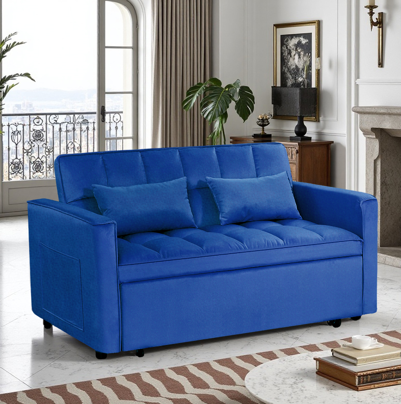 Sofá de Terciopelo Moderno Reclinable y Plegable de 2 Plazas, Cama Extraíble de 54 Pulgadas para Sala de Estar y Dormitorio de Hotel, Azul Oscuro