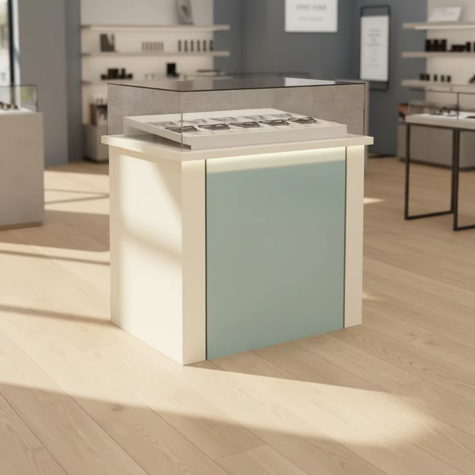 Mostrador de Exhibición Moderno para Minoristas, Mesa de Exhibición con Tapa de Vidrio, Gabinete de Almacenamiento con Iluminación LED para Joyería y Óptica