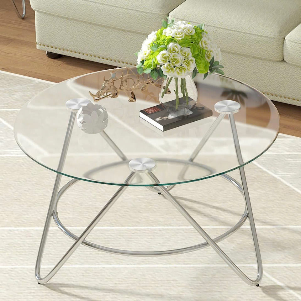 Mesa de centro redonda moderna con tapa de vidrio templado, marco cromado, acabado plateado para sala de estar