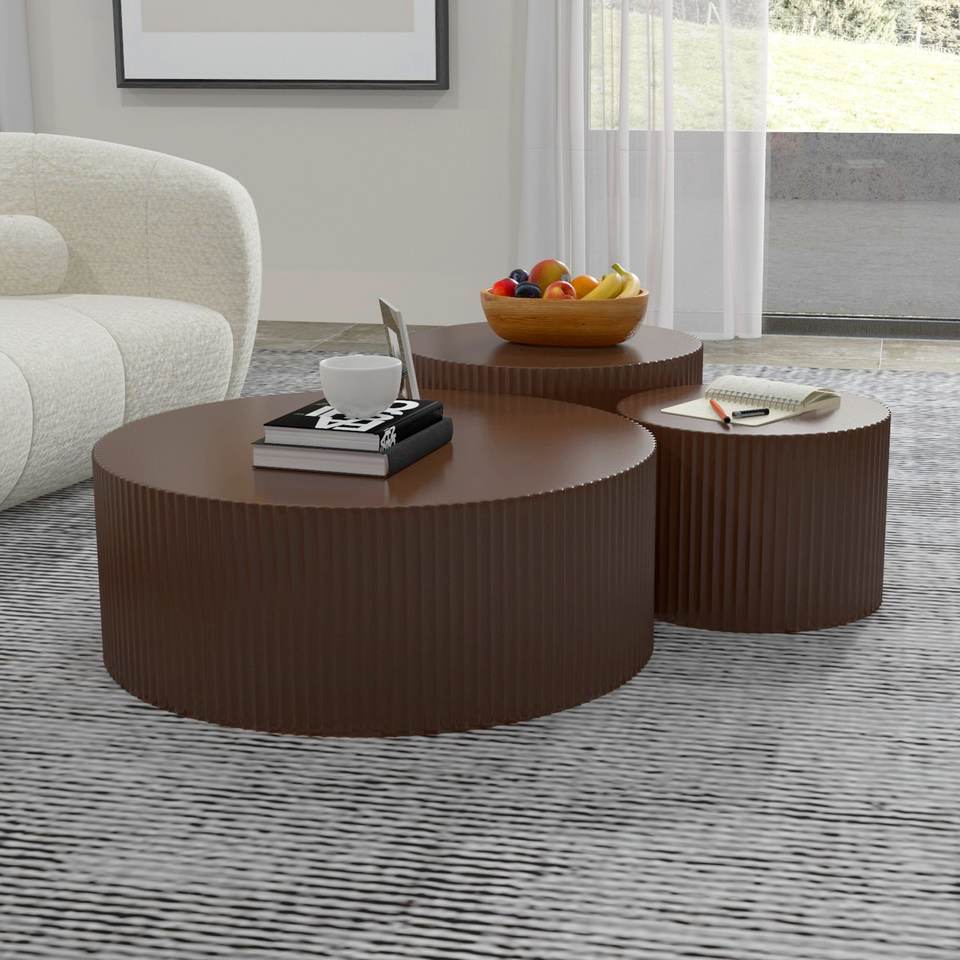 Juego de 3 Mesas de Centro Redondas Modernas con Diseño Acanalado, Color Marrón Oscuro de Lujo, para Sala de Estar