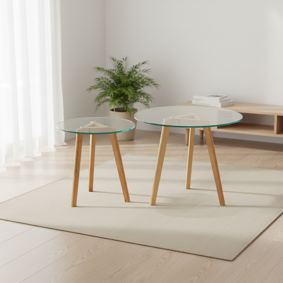 Mesa Auxiliar Moderna con Tapa Redonda de Vidrio y Patas de Madera, Estilo Nórdico, Mesa de Centro para Sala de Estar o Dormitorio