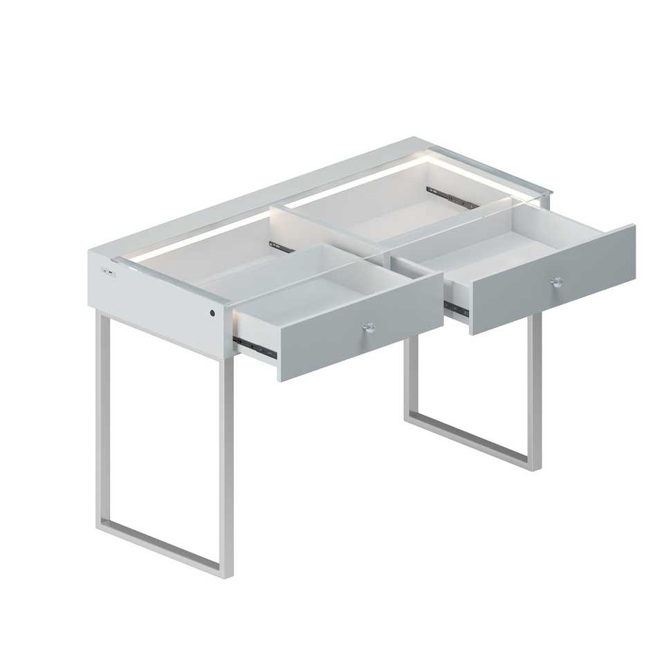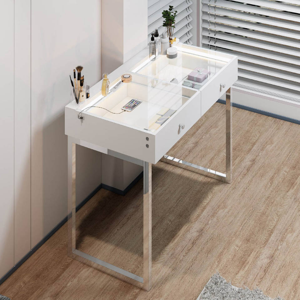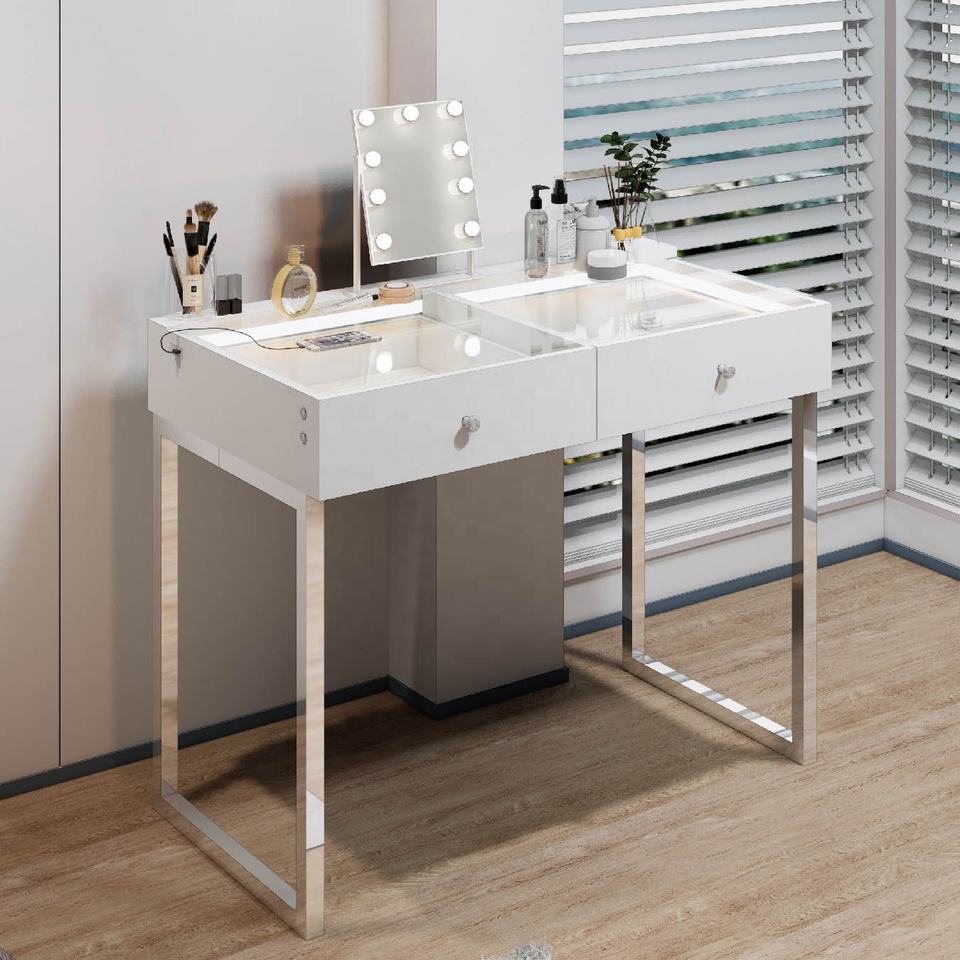 Cómoda Simple Moderna de 2 Cajones con Pierna de Hierro, Espejo de Vanidad, Silla, Panel de Estilo de Madera para Dormitorio, Hotel, Apartamento, Almacenamiento