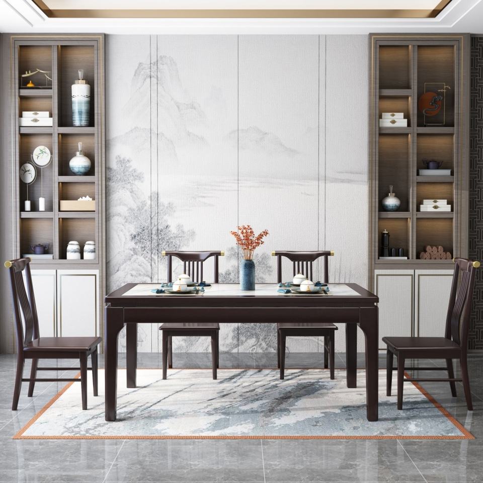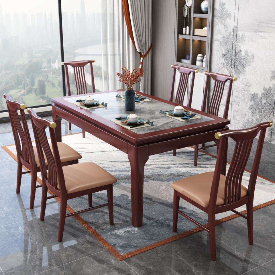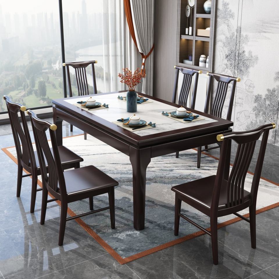 Juego de Comedor Moderno y Sencillo con Estructura de Madera Sólida y Mesa de Comedor de Piedra Sinterizada, Mesa Rectangular de Madera con Pizarra
