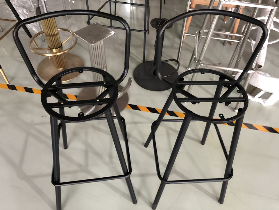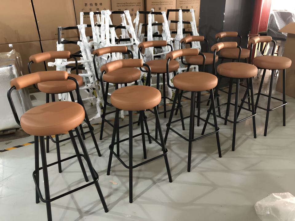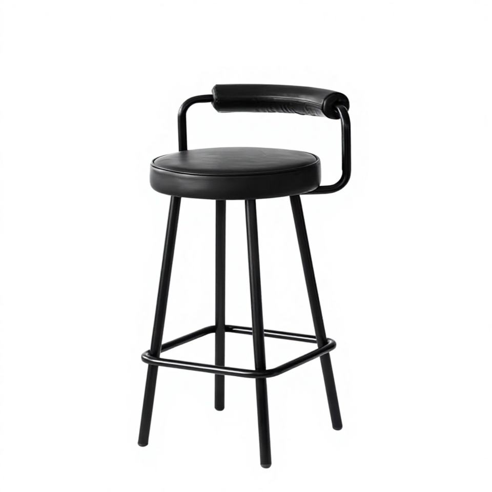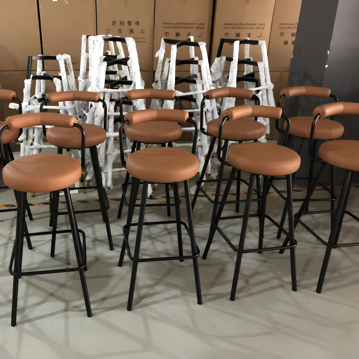 Taburete de barra moderno y sencillo de hierro con respaldo alto, estructura de acero de grado comercial y diseño circular, para tienda de té con leche y uso en barras domésticas