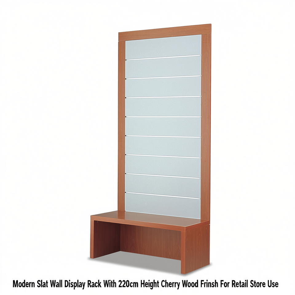 Exhibidor de Pared con Listones Moderno con Base, 220 cm de Altura, Acabado en Madera de Cerezo, para Uso en Tiendas Minoristas