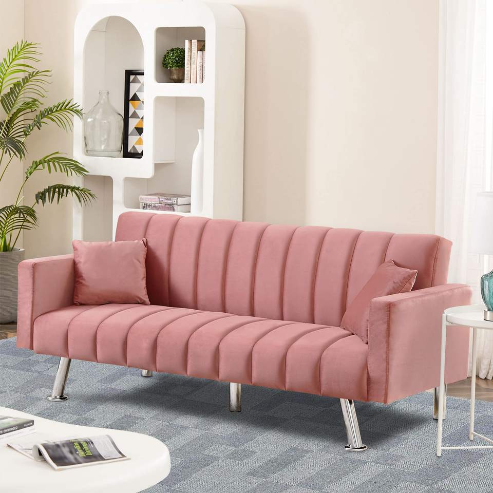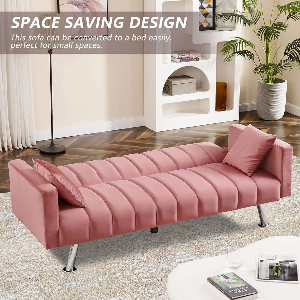 Sofá Moderno Tapizado Convertible en Cama con 2 Almohadas, Sofá Cama de Terciopelo con Armazón de Madera y Patas de Metal - Rosa