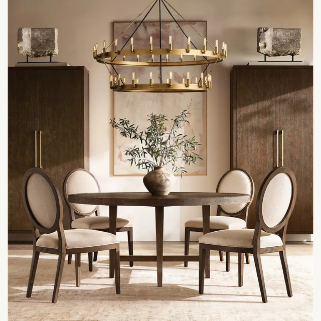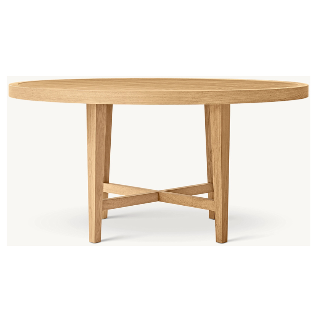 Mesa de Comedor Redonda Moderna de Madera de Teca Maciza con Tablero de Listones Anchos y Base de Patas Cruzadas para Espacios de Comedor en Interiores, Hoteles y Exteriores