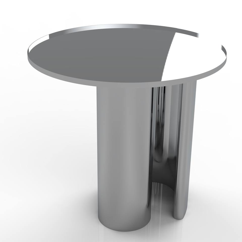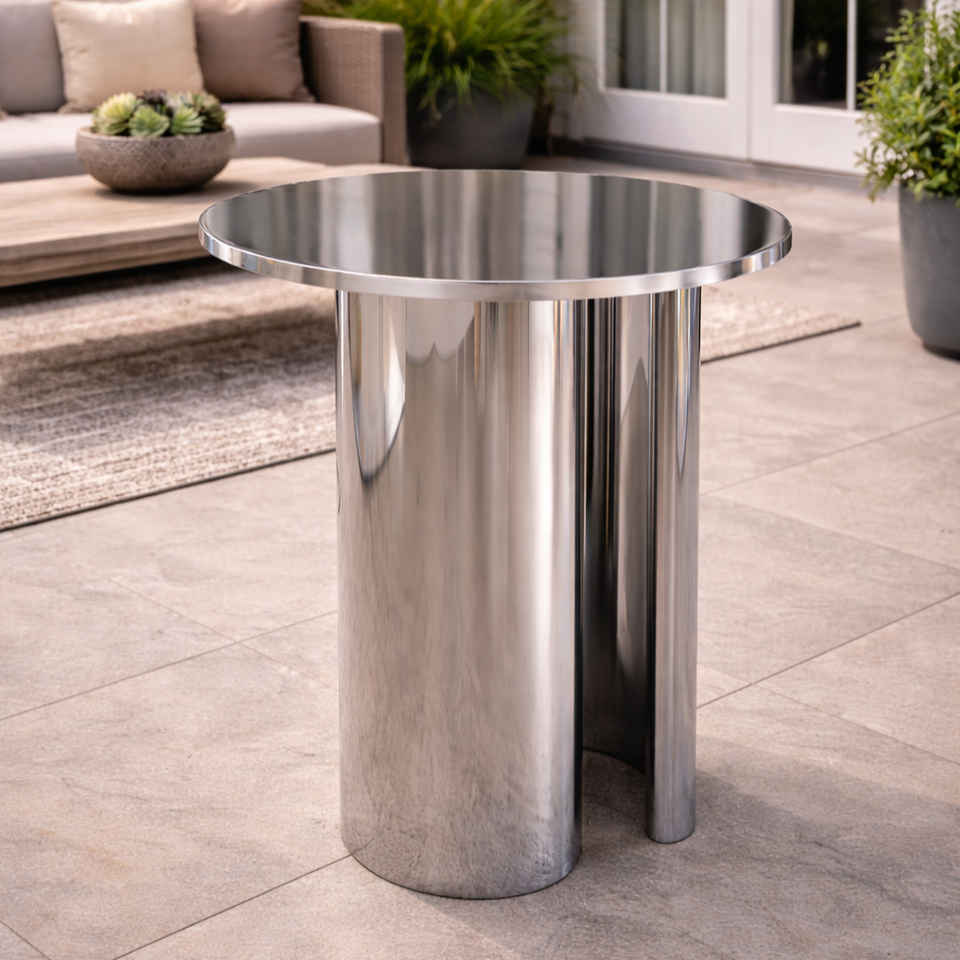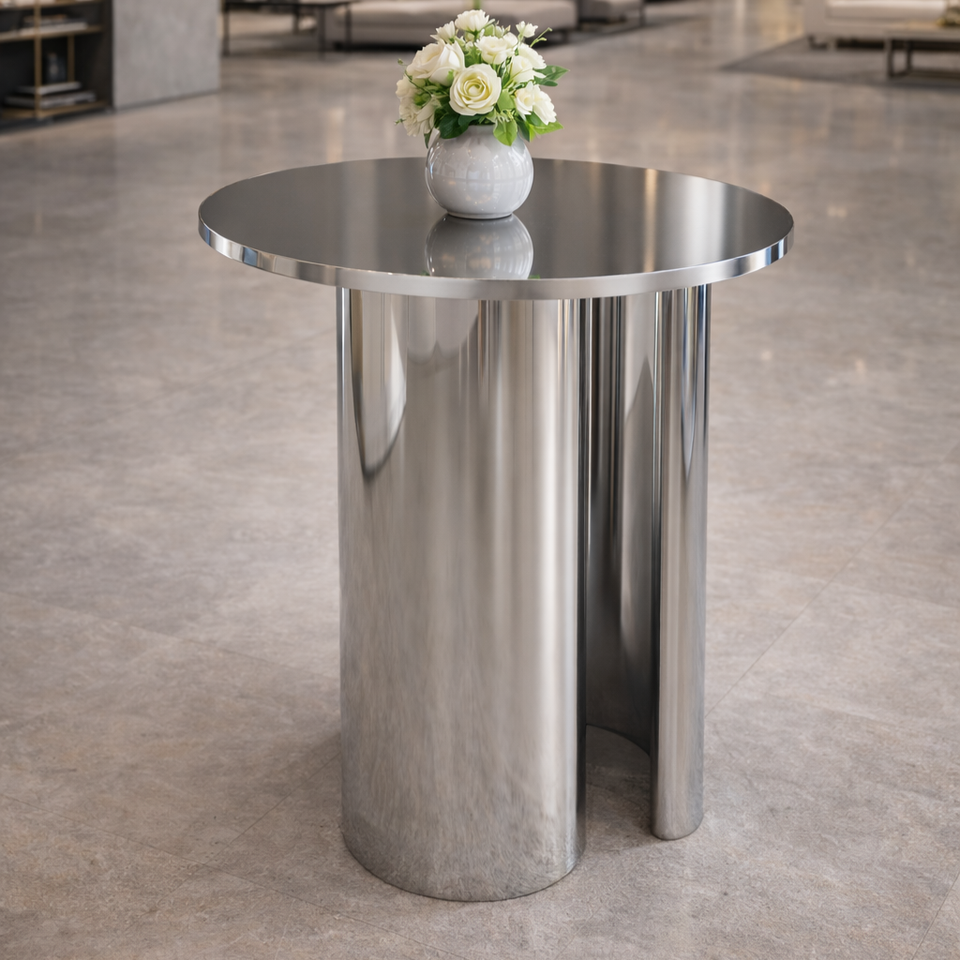 Mesa Auxiliar Moderna y Duradera de Acero Inoxidable Metal Drake, Acabado Pulido Espejo, Base Cilíndrica para Espacios de Vida de Lujo