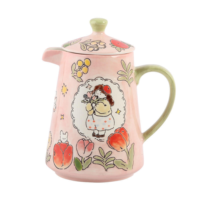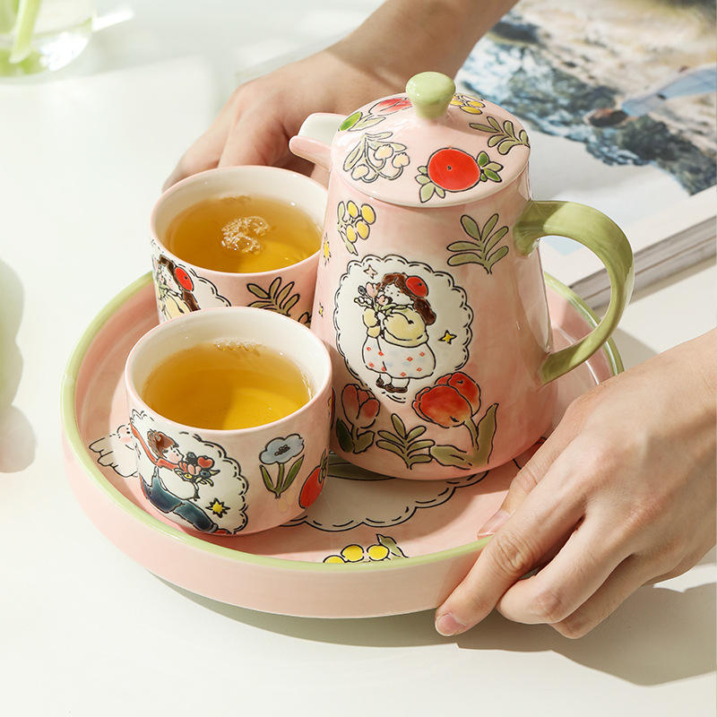 El juego de té de cerámica pintado a mano de estilo moderno incluye tetera y tazas de té con bandeja integrada para uso en el hogar o regalo para parejas