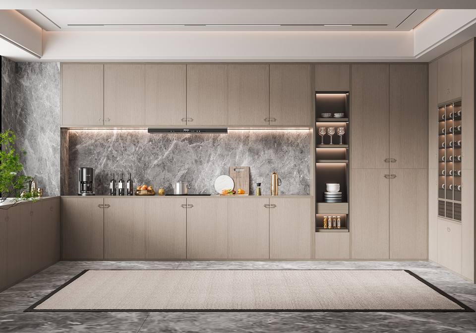 Muebles de Cocina Modernos de Madera Contrachapada, Cajones de Almacenamiento Personalizables, Plataforma de Isla Central, Muebles de Restaurante Ecológicos