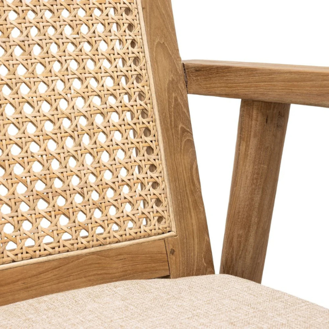 Silla de Comedor Moderna de Ratán y Madera de Teca con Reposabrazos Rectos y Asiento Acolchado para Restaurante, Hotel, Apartamento