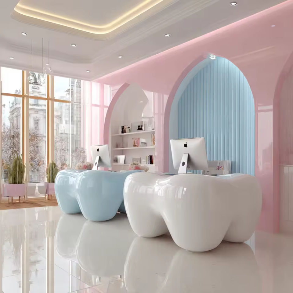 Mostrador de Recepción Moderno en Forma de Diente para Clínica Dental en Colores Rosa y Azul
