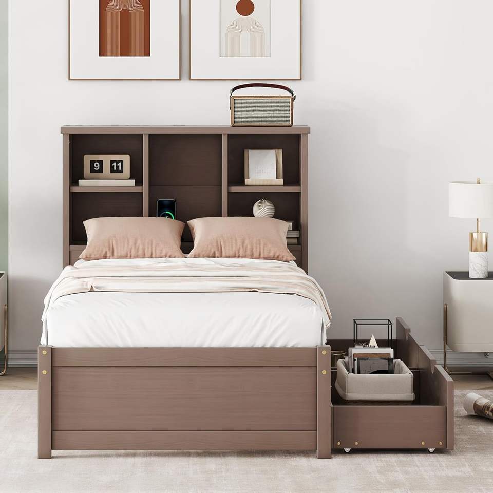 Estructura de cama moderna de nogal de tamaño doble con puerto USB incorporado Cabecero de librería de madera y 2 cajones