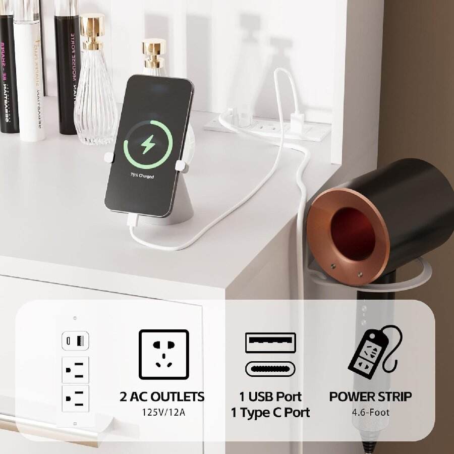 Espejo de tocador moderno con luces LED, toma de corriente, 7 cajones y 6 estantes, diseño de panel de tamaño personalizado para dormitorio o vestidor