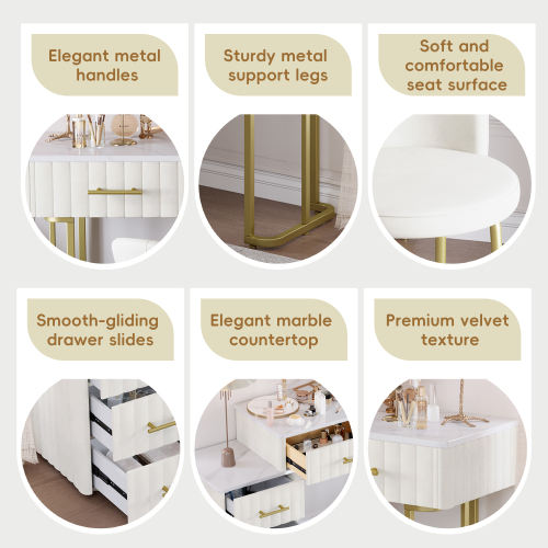 Escritorio de tocador moderno tapizado en terciopelo con espejo iluminado por LED, silla acolchada, mesa de tocador con almacenamiento ajustable izquierda/derecha, beige