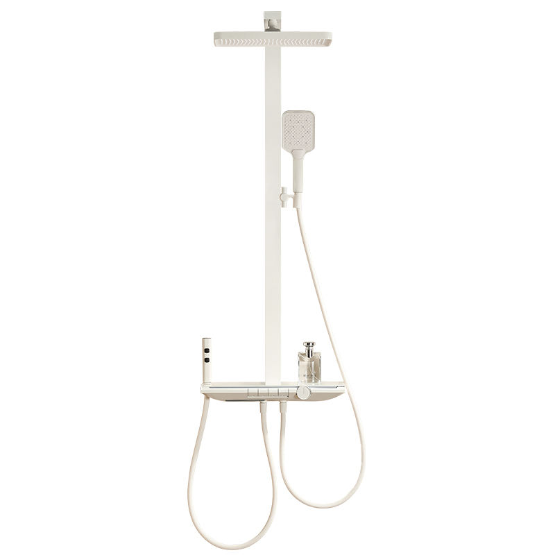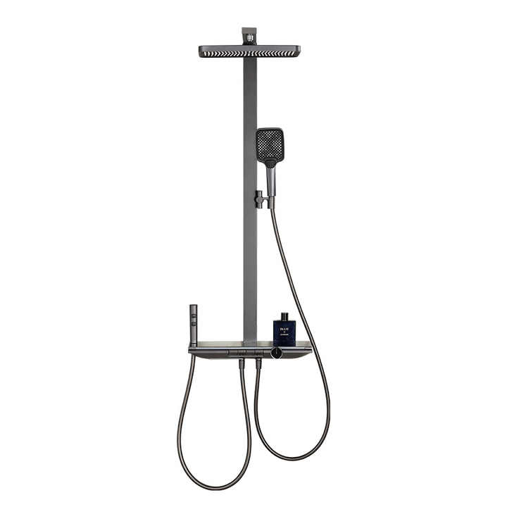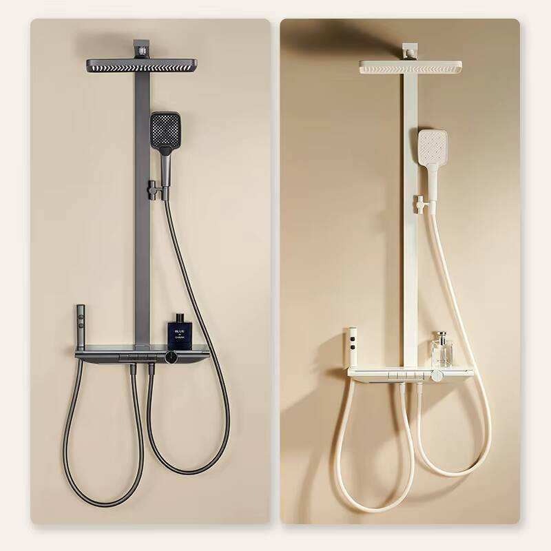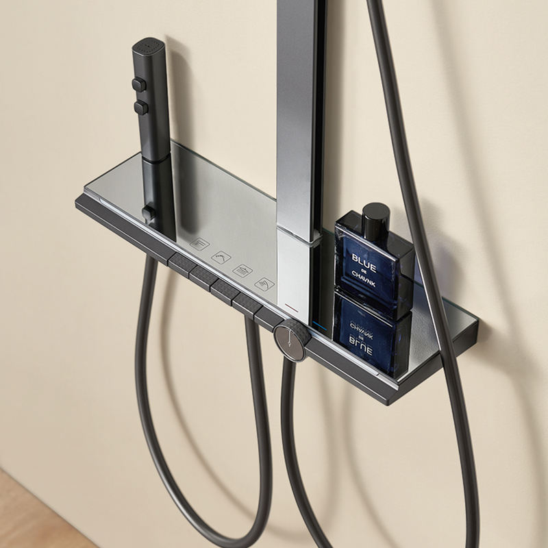 Sistema de ducha y grifería digital moderno de pared con columna mezcladora y estante de almacenamiento