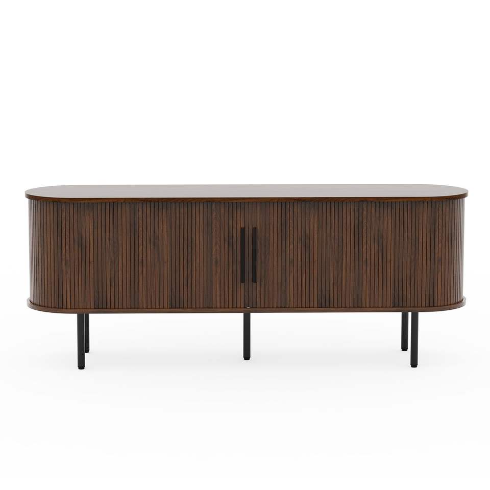 Mueble de TV Moderno de Aglomerado con Relieve de Nogal, con Tablero Ovalado de 147 x 35,58 cm y Puerta Corredera con Rejilla, Centro de Entretenimiento