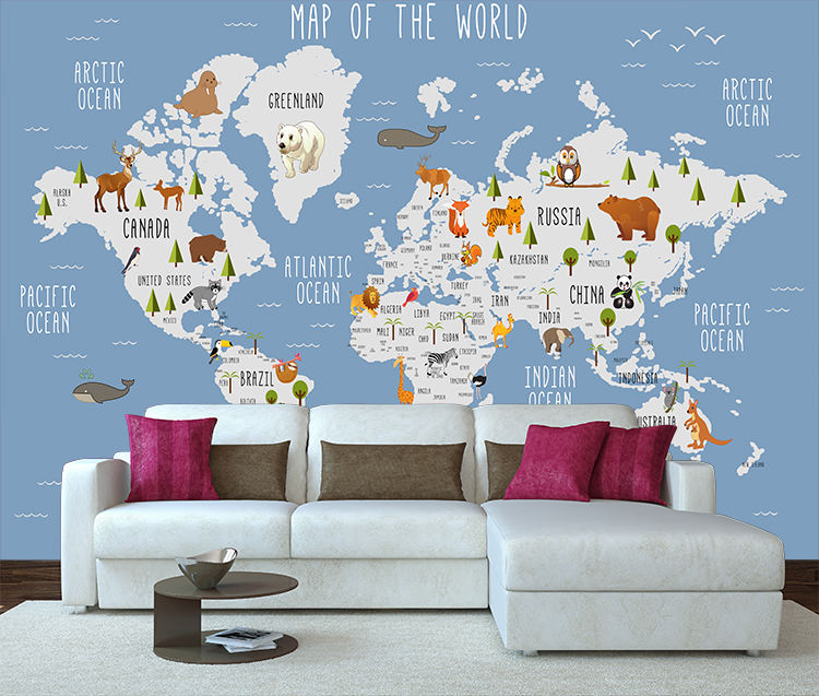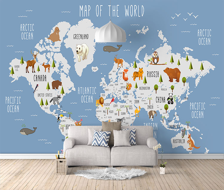 Papel Tapiz Moderno Impermeable con Mapa del Mundo de Dibujos Animados para Niños, Mural Educativo con Ilustraciones de Animales para Decoración de Cuarto de Niños, Baño y Dormitorio