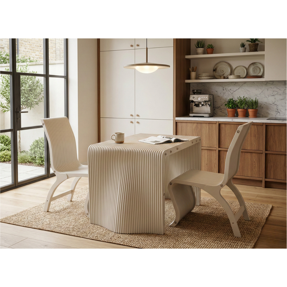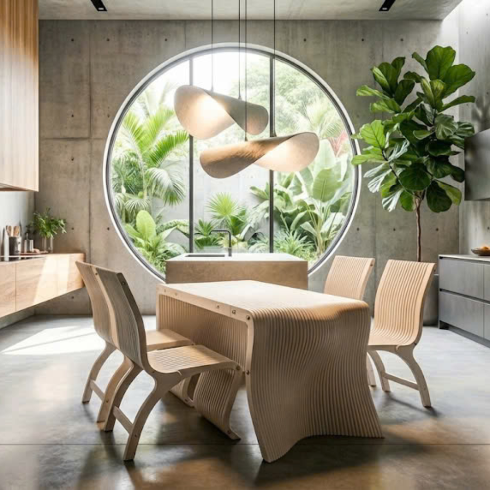 Mesa de Comedor de Madera Impermeable Ecológica con Diseño Moderno en Forma de Ola, 1 Año de Garantía, Solución Completa para Uso en Exteriores