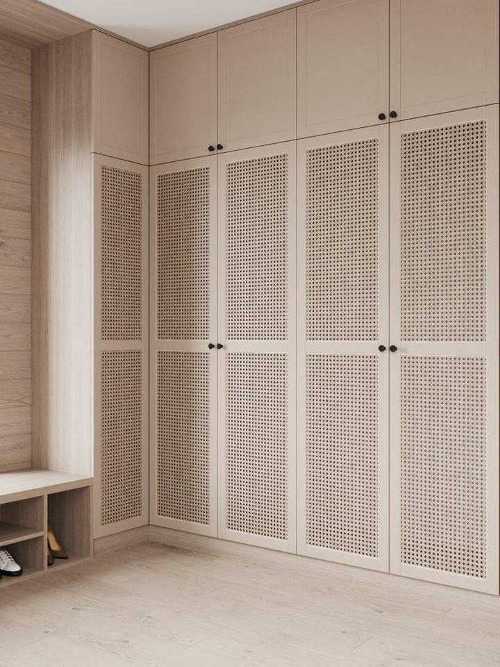 Armario empotrado moderno de color blanco con puertas de panel e iluminación superior