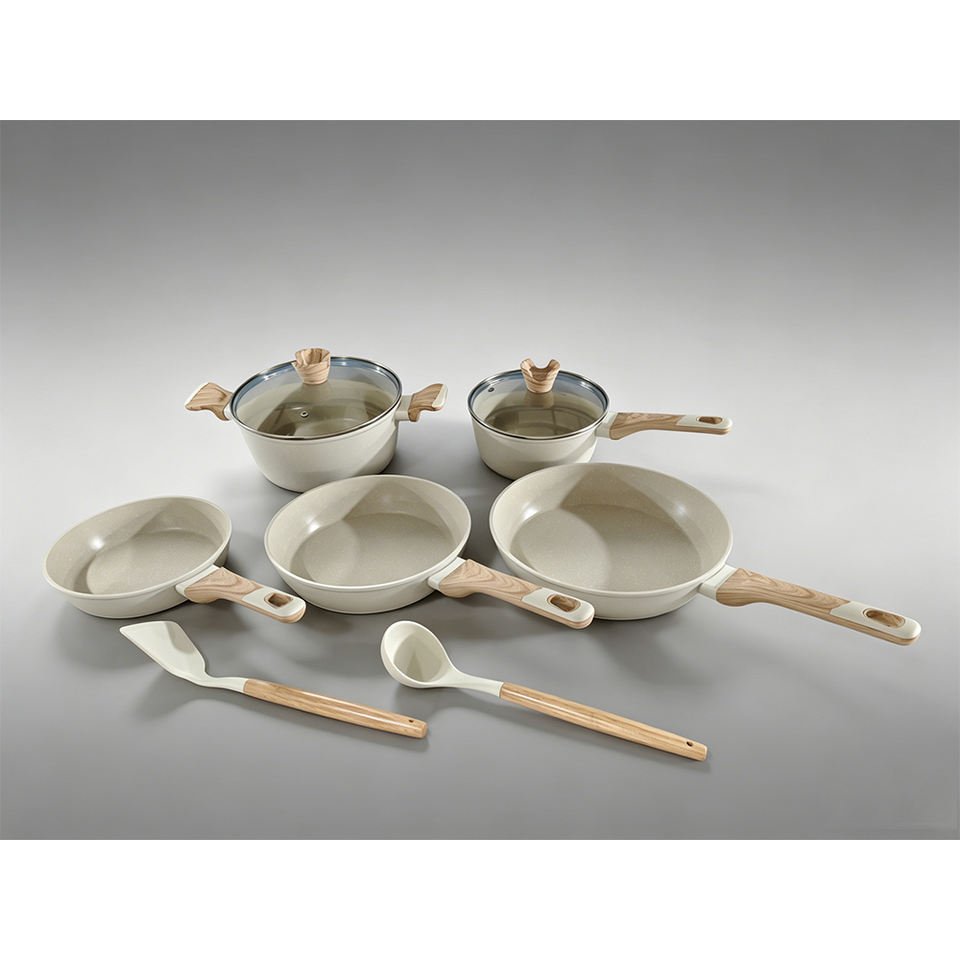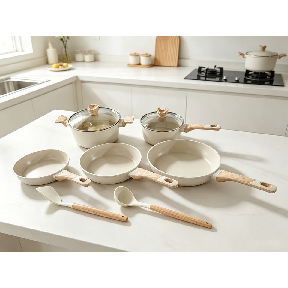 Juego de Cocina Moderno de 10 Piezas de Granito Blanco Antiadherente, Compatible con Inducción, con Tapas de Vidrio, Ollas y Sartenes
