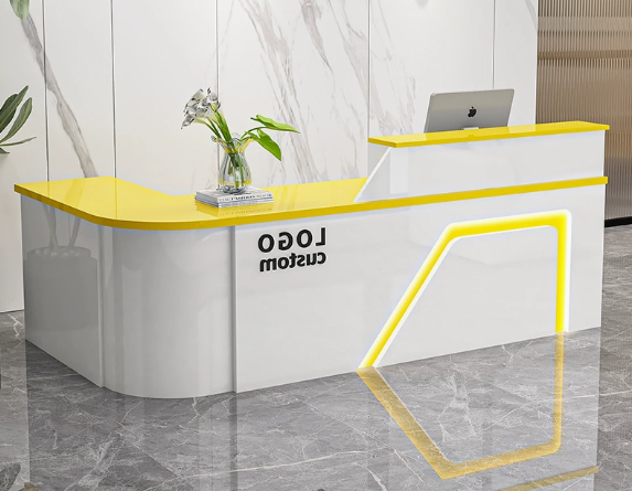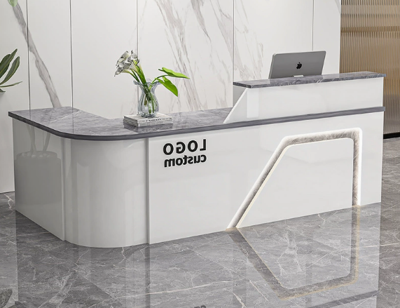 Mostrador de Recepción Moderno en Forma de L, Color Blanco, con Luz LED, Acrílico, Muebles de Oficina Minimalistas, Logotipo Personalizado, Mesa de Bienvenida Comercial