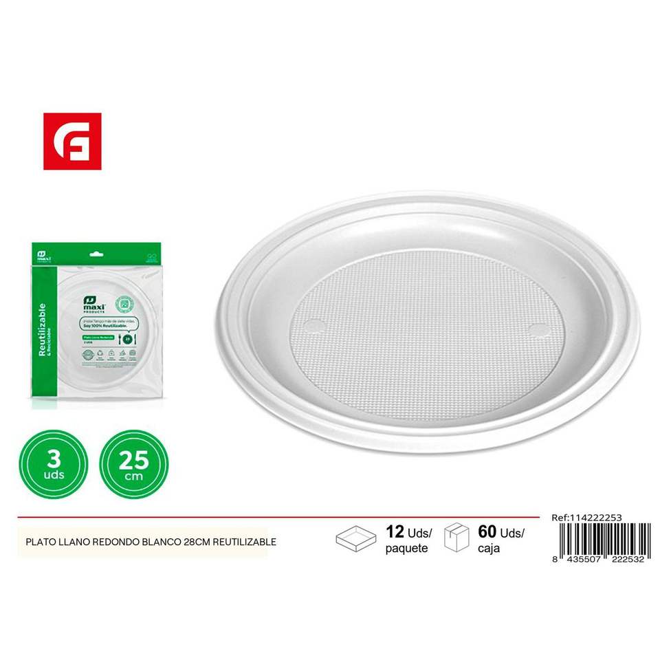 Plato Redondo Grande de 28 cm, Blanco, Vajilla de Plástico Reutilizable para Bodas