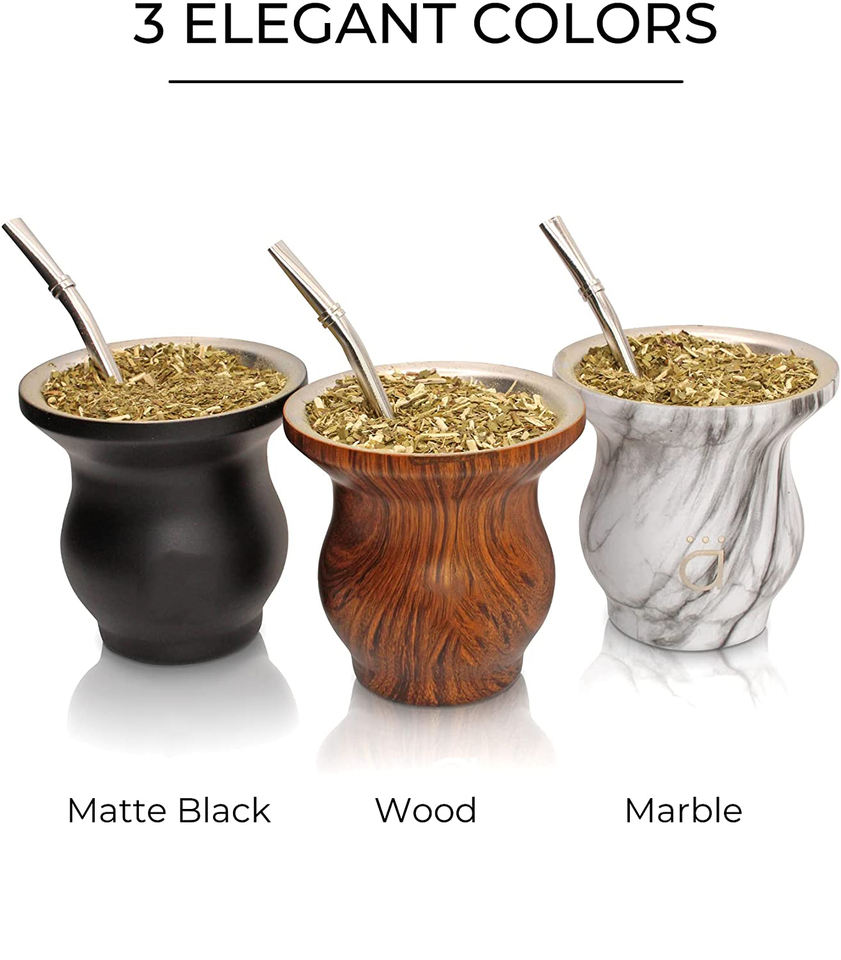 Yerba-calabaza Mate moderna, doble pared, acero inoxidable 18/8, incluye Bombilla y un cepillo de limpieza, 9 oz/270ml (negro/mármol)
