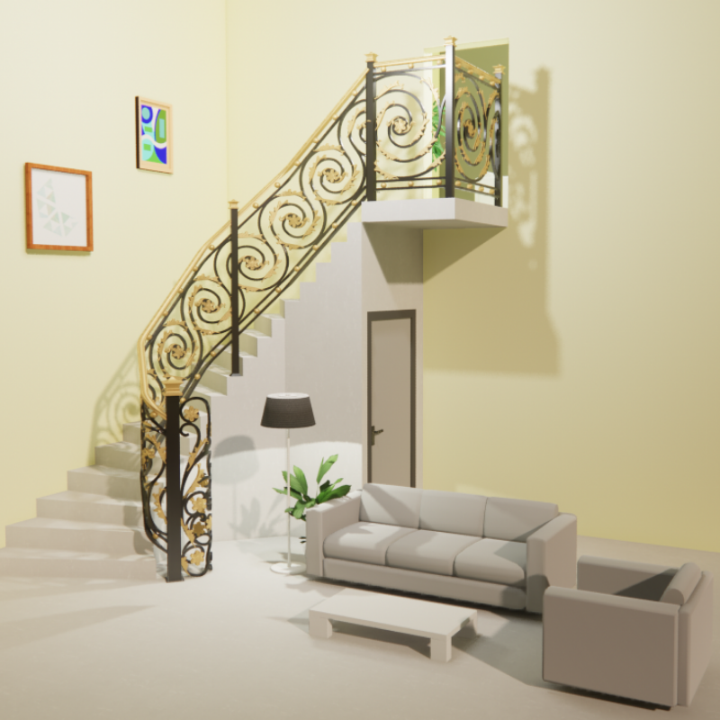 Barandilla de escalera moderna de hierro forjado para interiores contemporáneos que ofrece resistencia, elegancia y estilo artístico para escaleras únicas.