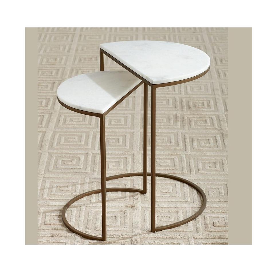 Juego de mesas nido modernas de metal con elegante estructura negra y diseño compacto que ahorra espacio, perfecto para interiores de salas de estar con estilo.