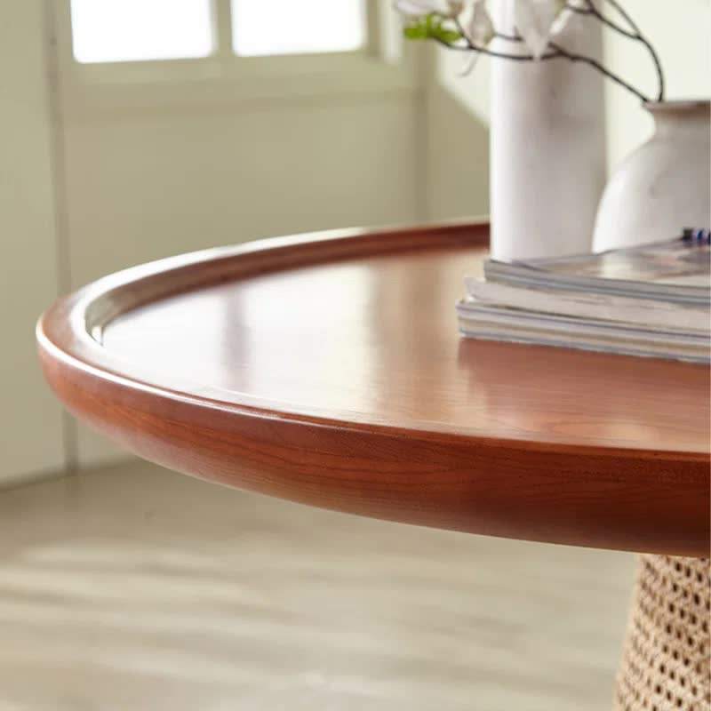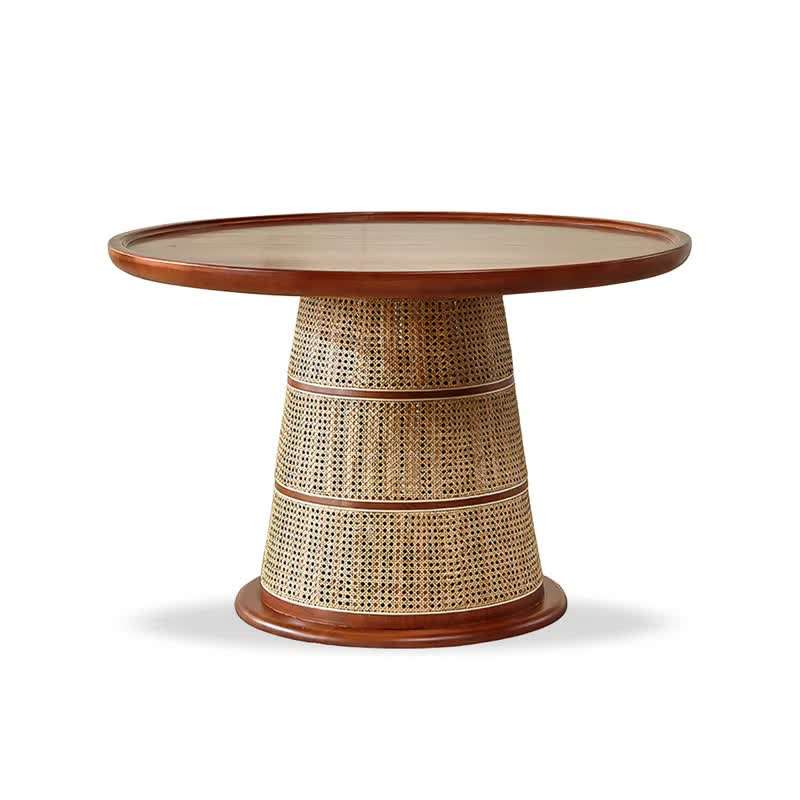 Mesa de comedor redonda moderna con estructura de madera de teca maciza y mimbre de ratán de alta calidad con color natural para uso en interiores y exteriores.