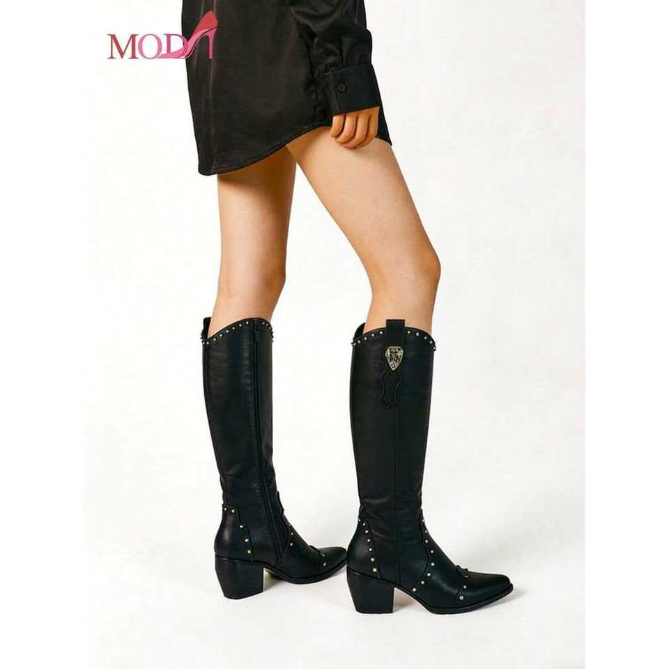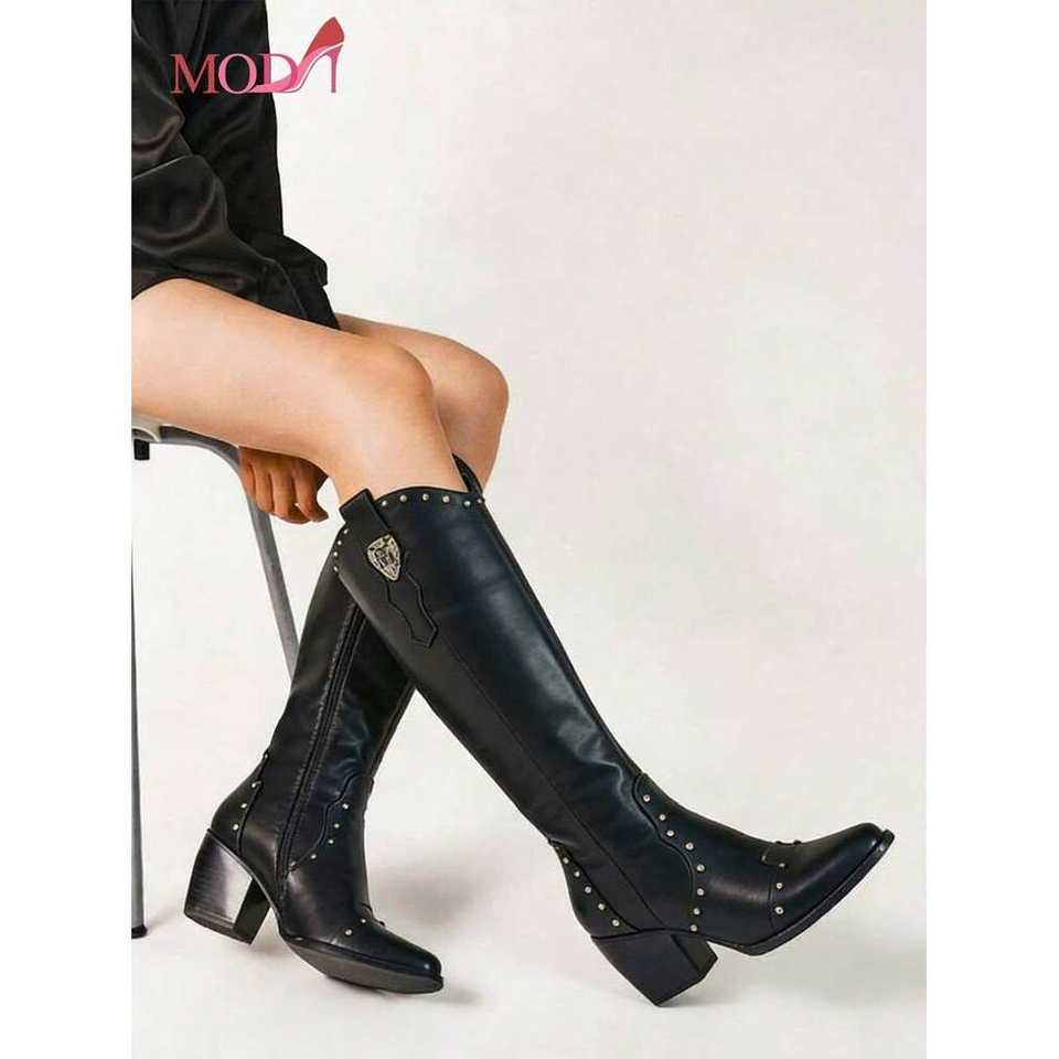 Botas Altas Modi con Decoración de Remaches y Tacón Grueso, Color Negro, para Oficina, Mujer