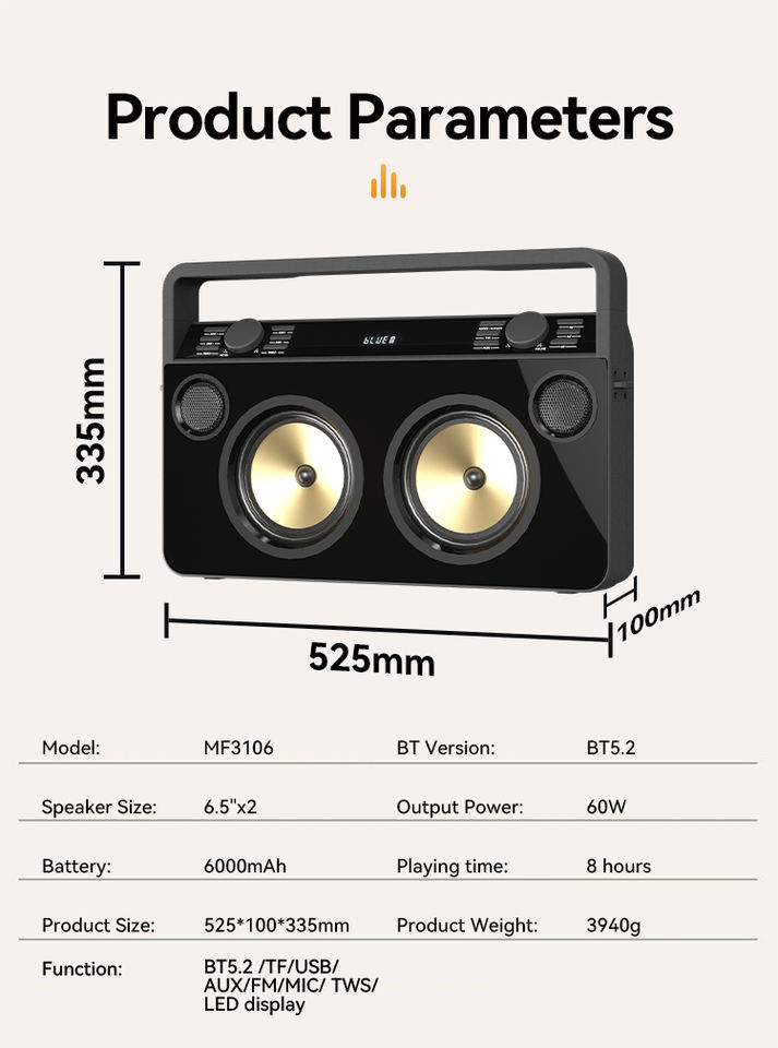 Uso:Teatro en casa, Reproductor de audio portátil, Al aire libre, Reproductor de karaoke