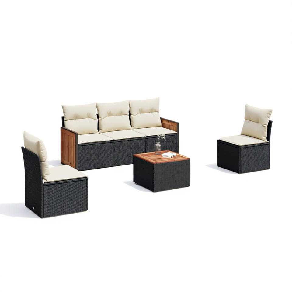 Conjunto de Sofás Modulares de Jardín en Ratán PE Negro, Muebles Resistentes para Exteriores con Cojines de Espuma de Alta Densidad