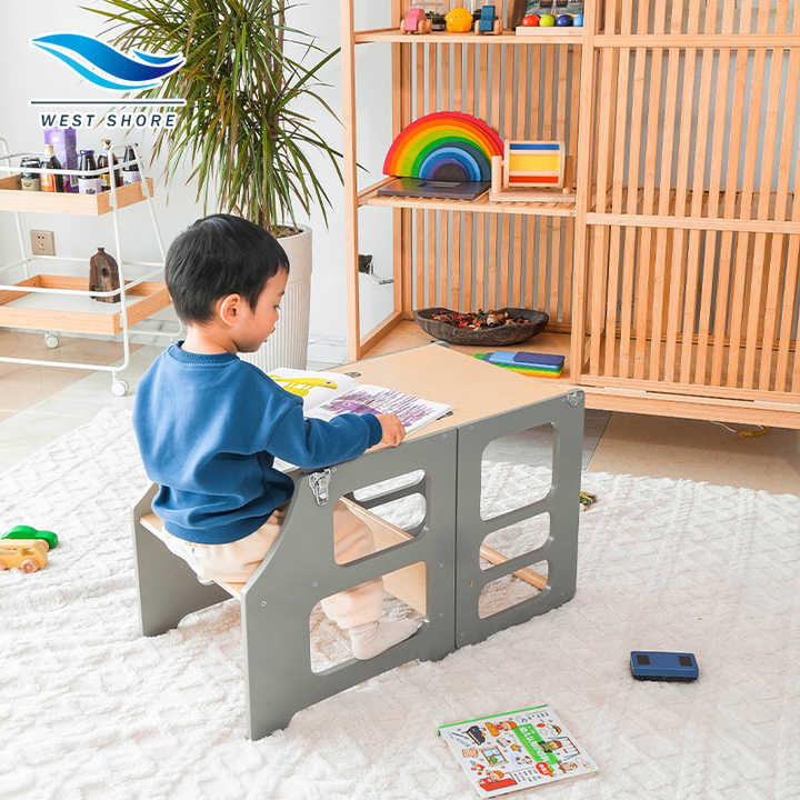 Mesa de actividades Montessori convertible ajustable para niños 3 en 1 ayudante de cocina para niños mesa de comedor de aprendizaje con taburete escalonado para Baño