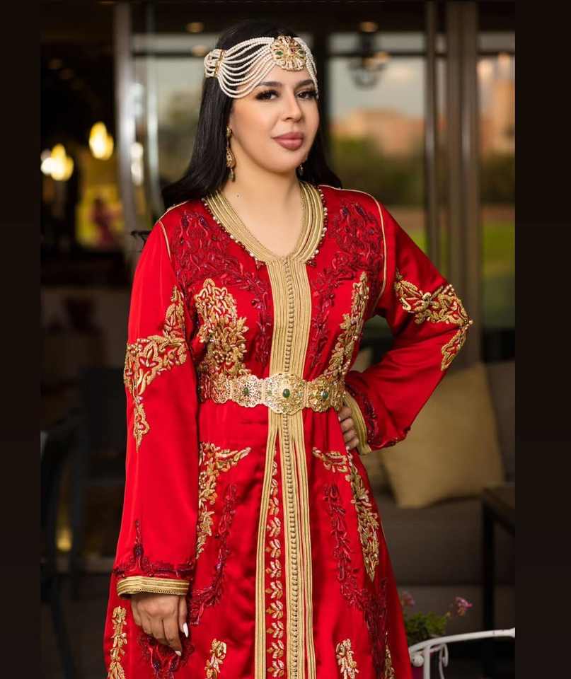 Caftán marroquí informal bordado a mano de seda roja Georgette ropa musulmana tradicional