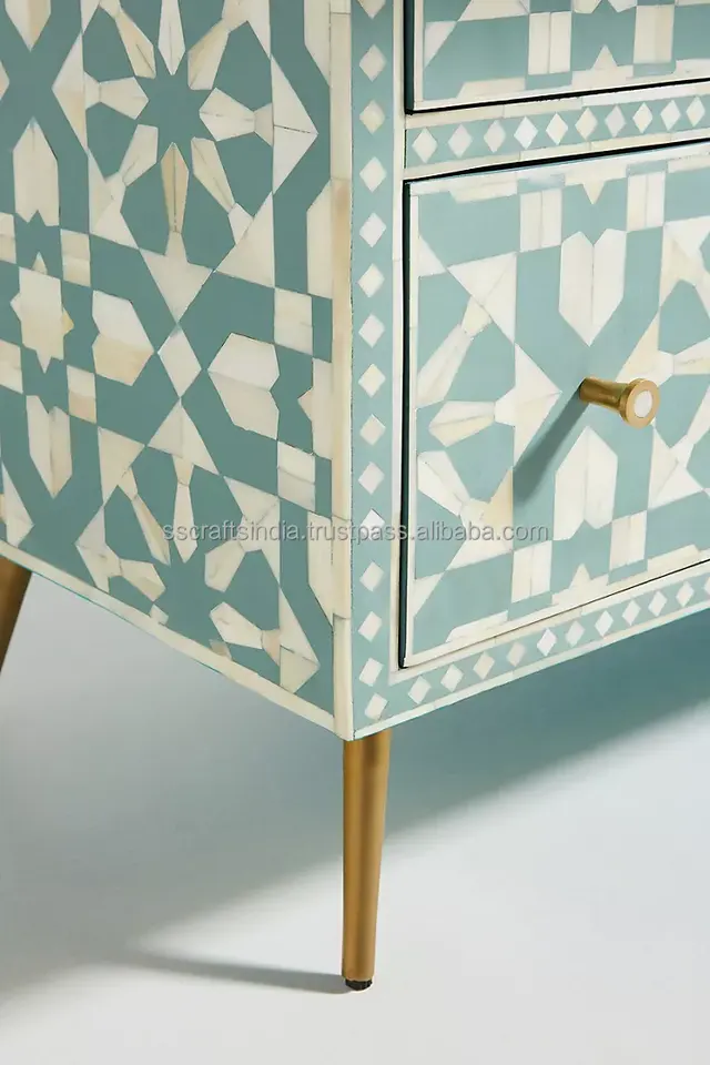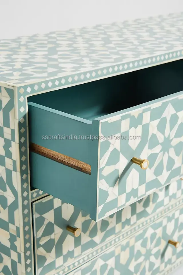 Cómoda de Estilo Marroquí con Incrustaciones de Hueso, 9 Cajones, Aparador con Incrustaciones de Hueso en Verde, Muebles con Incrustaciones de Hueso, Cómoda con Incrustaciones de Hueso