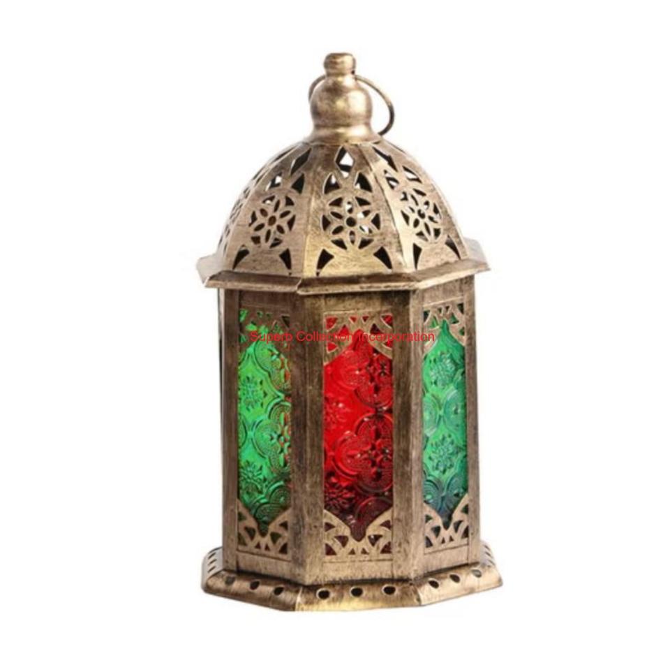 Linterna marroquí con vidrieras en relieve Vintage Metal Ramadán Eid portavelas decorativo para decoración de jardín
